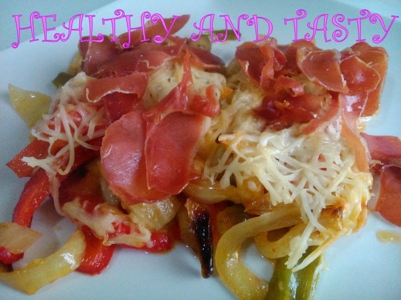 Lavamos las verduras. Pelamos el calabacín, la berenjena y el tomate y los cortamos en rodajas. Cortamos los pimientos y la cebolla en juliana (tiras). Ponemos en una fuente de horno una cucharada de aceite de oliva. Vamos colocando la verdura en la fuente y le añadimos un poco de sal y otra cucharada de aceite por encima. Metemos al horno con calor arriba y abajo durante 50-60 minutos, dependiendo del horno. Cada 10 minutos, vamos removiendo las verduras, para que se hagan todas por igual y no se quemen las de arriba. Cuando estén las verduras cocinadas, agregamos el queso rallado y gratinamos. Cuando el queso esté casi listo, ponemos las lonchas de jamón cortadas en trocitos pequeños por encima y metemos al horno a que se doren un poco. Cuando esto ocurra, sacamos del horno y servimos.