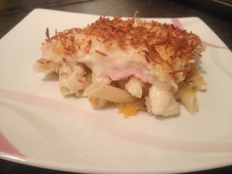 4º - Sobre la fuente con macarrones echamos las tiras de jamón de york , la cebolla , la calabaza y el perejil picado . Removemos todo bien y añadimos los trocitos de huevo cocido , para después verter toda la bechamel por encima de todos los ingredientes .