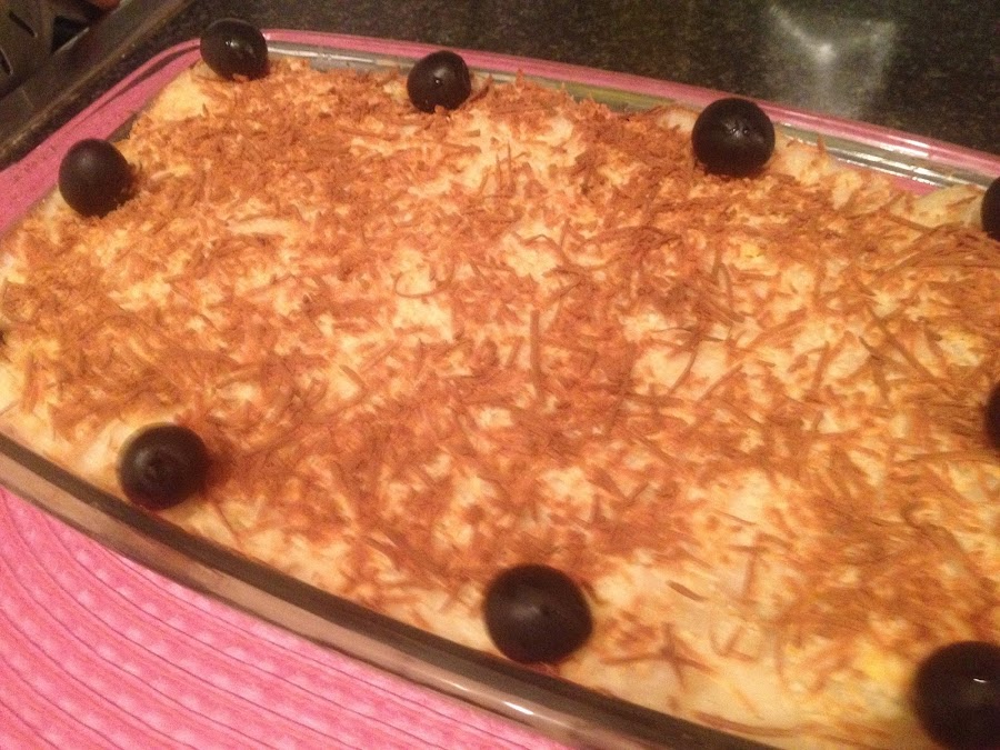 5º - Ahora espolvoreamos la mozzarella cubriendo ligeramente la bechamel y adornamos con las aceitunas negras . Precalentamos el horno a 180º .