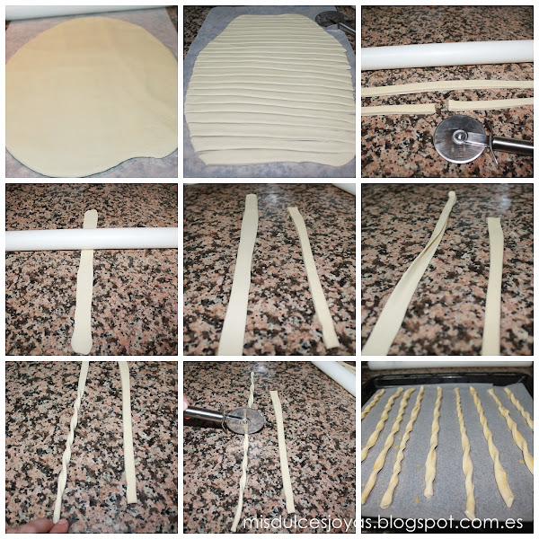 Cortar cada tira por la mitad, y estirar con un rodillo hasta que quede muy fina. Mojar un pincel de cocina con un poco de agua (muy poco), y pasarlo por uno de los bordes de la tira. Doblarla sobre si misma y sellar los bordes (el agua nos ayuda a que se sellen, y a la hora del horneado no se nos abran). Entrenzar, y si el tamaño de los grisines nos gusta los dejamos tal cual, y si no, los cortamos del tamaño deseado.
