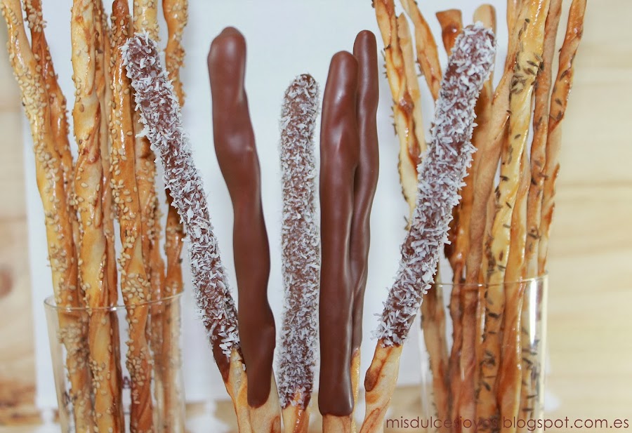 Nota: Si se quieren conseguir unos grisines dulces bañados de chocolate, no hace falta esparcir las semillas por encima de la tiras, solo hay que pincelar las mismas con el huevo. Una vez horneados y enfriados los grisines se bañan con el chocolate fundido.
