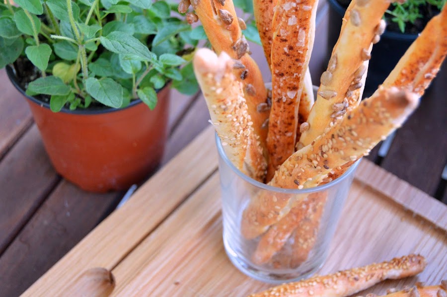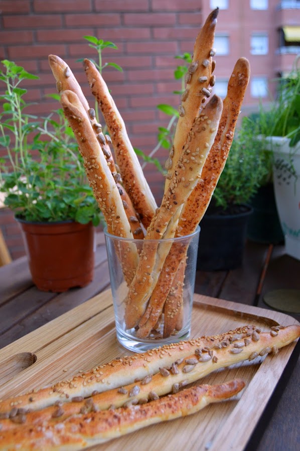 Yo he hecho tres versiones: Pipas de girasol, semillas de sésamo y pimentón dulce con escamas de sal. La mejor, la de pipas, recuerdos de infancia de mis meriendas con mis "palitos" y deliciosas con el hummus de tomate seco!