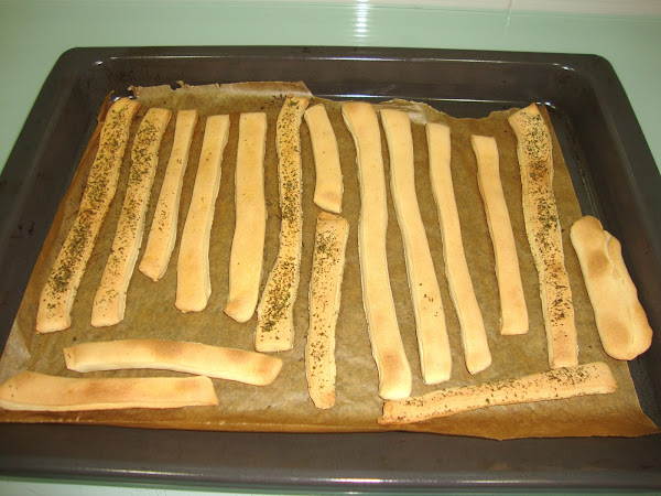 Se pone a calentar el horno a 250ºC con un recipiente con agua en la parte de abajo para que suelte vapor, una vez que el horno alcanza los 250ºC se introducen las tiras de pan y se cuecen durante unos 10-12 minutos (hasta que tenga el dorado que nos gusta).