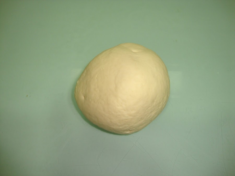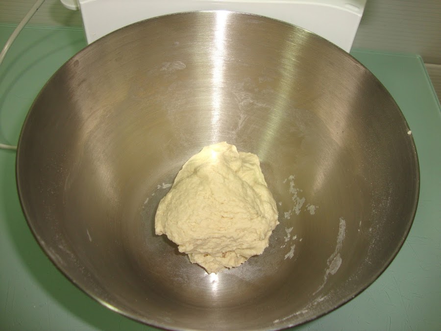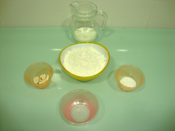 En un cuenco se pone la harina con la sal y se le va añadiendo la leche mientras lo amasamos (con el gancho amasador), cuando esté toda la harina húmeda se le añade el agua con la levadura y se amasa un poco más.