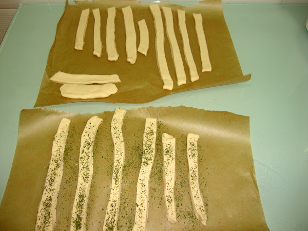 Se dejan reposar las tiras de pan cortadas unos 45 minutos para que leve un poco la masa (yo puse perejil en algunas por encargo de mi hija)