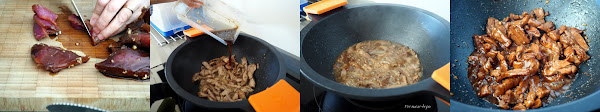 Colocar un wok o sartén al fuego con un par de cucharadas de aceite de cacahuete (u otro aceite vegetal). Cuando esté bien caliente añadir la carne de cerdo y saltear durante 4 - 5 minutos, que se dore un poco. Incorporar el líquido del marinado y llevar a ebullición, bajar el fuego a continuación y dejar reducir unos minutos, hasta que la salsa esté espesa y pegajosa.