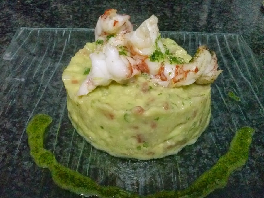 Por otro lado sacamos las gambas que habíamos reservado y las ponemos a gratinar durante un par de minutos en el horno por la parte de arriba. Las sacamos y colocamos dos de ellas sobre cada uno de los guacamoles que habíamos preparado y retiramos. Y ya lo tenemos listo para degustar!!!