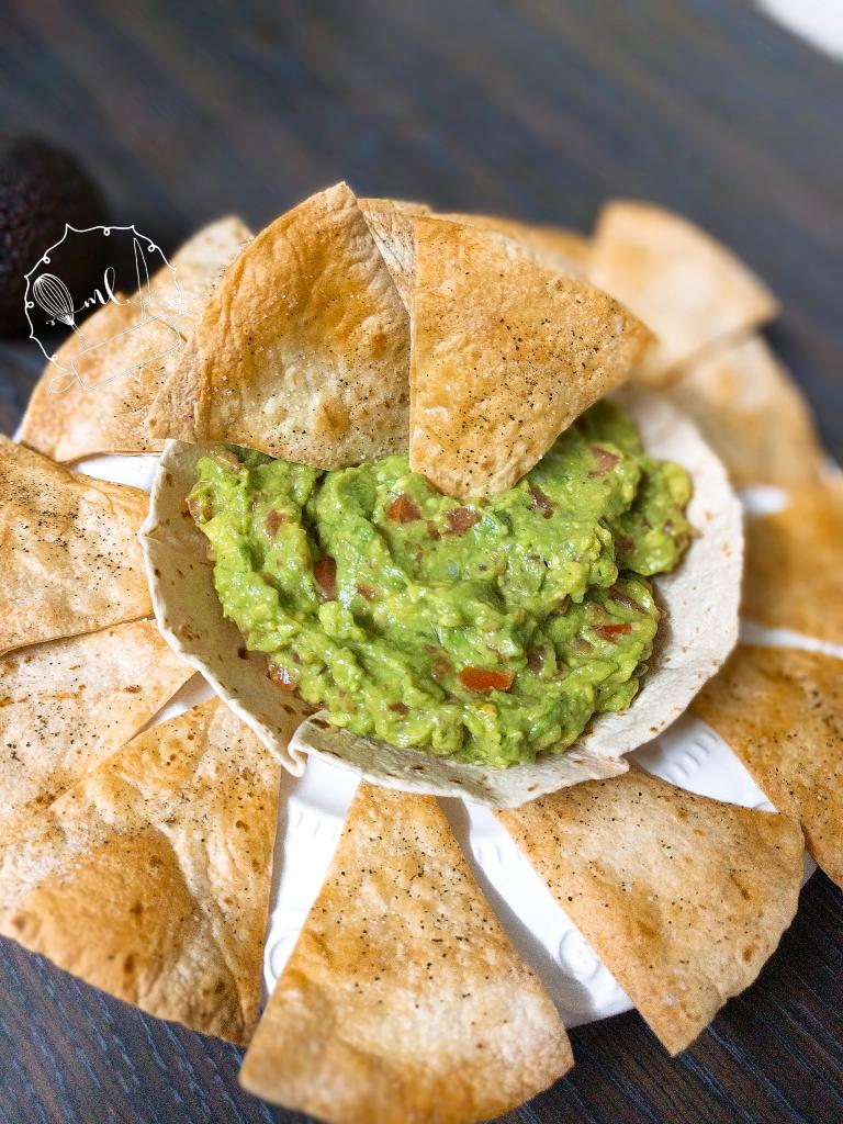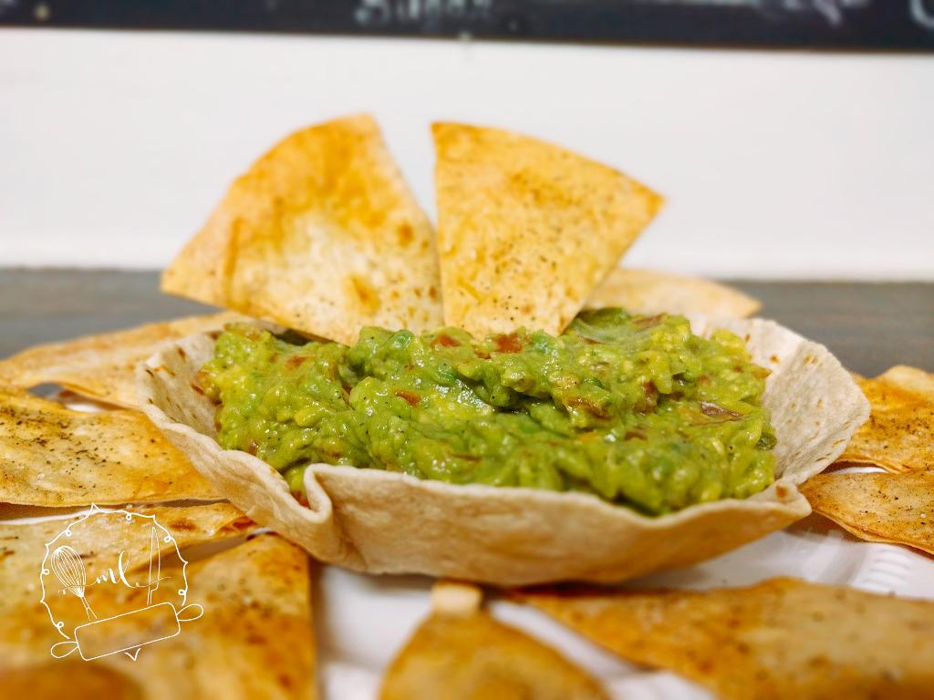 Colocamos el guacamole en el bol que hemos conseguido hacer con la tortilla, y disponemos alrededor los nachos caseros (y muchísimo mas saludables que los de bolsa).