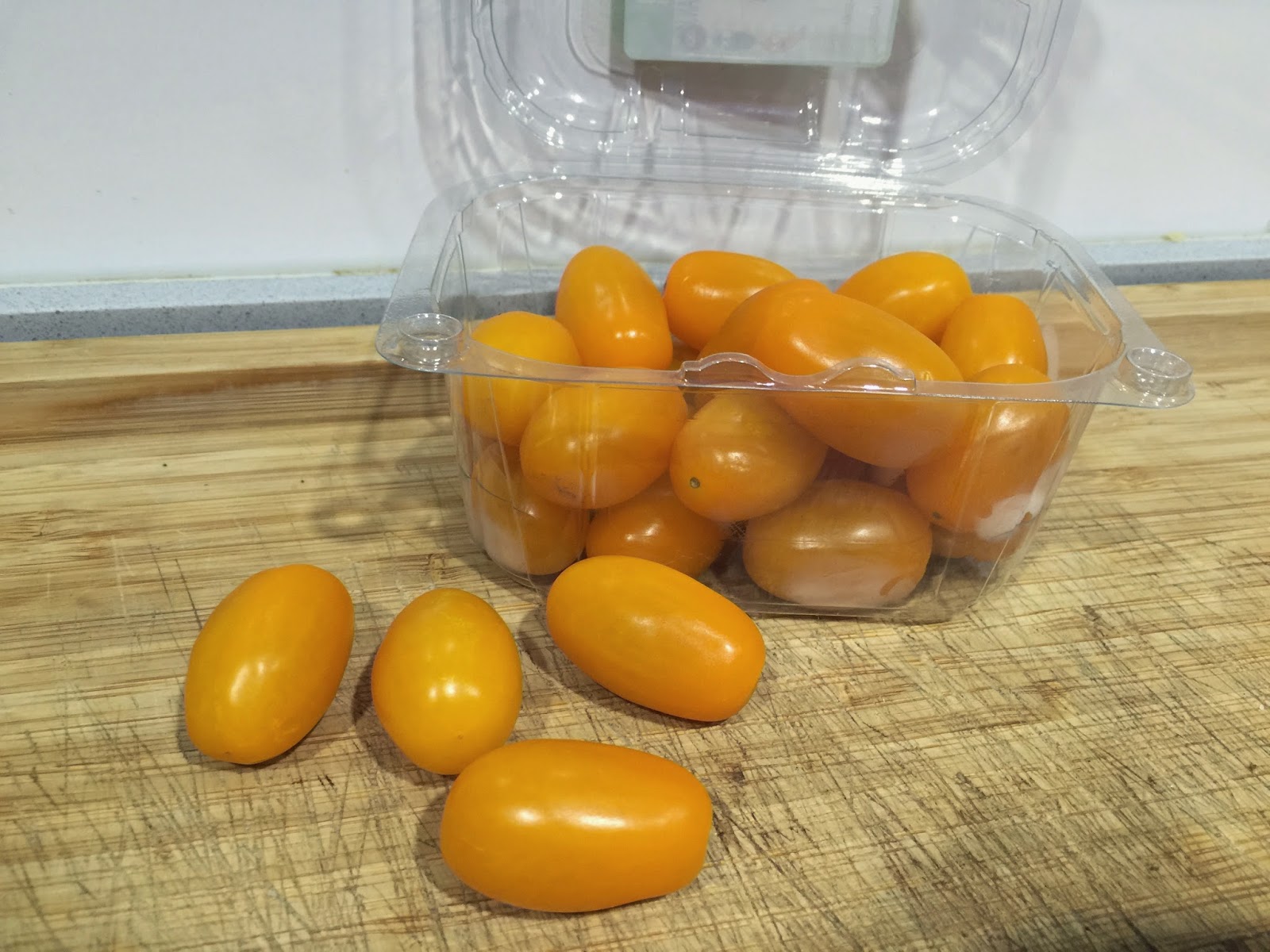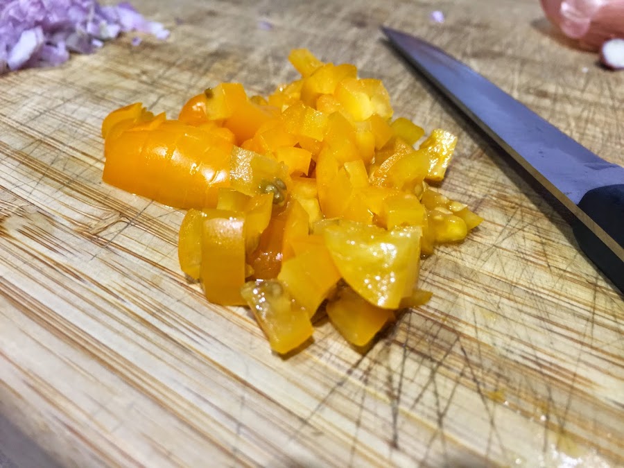 2. También escojo siempre tomate cherry. En esta ocasión amarillos, pero normalmente rojos. Al ser cherry el tamaño es ideal y contiene menos agua que el el tomate rojo maduro, así no agua tanto el guacamole. Los lavamos y los cortamos en trocitos lo mas pequeños posible.