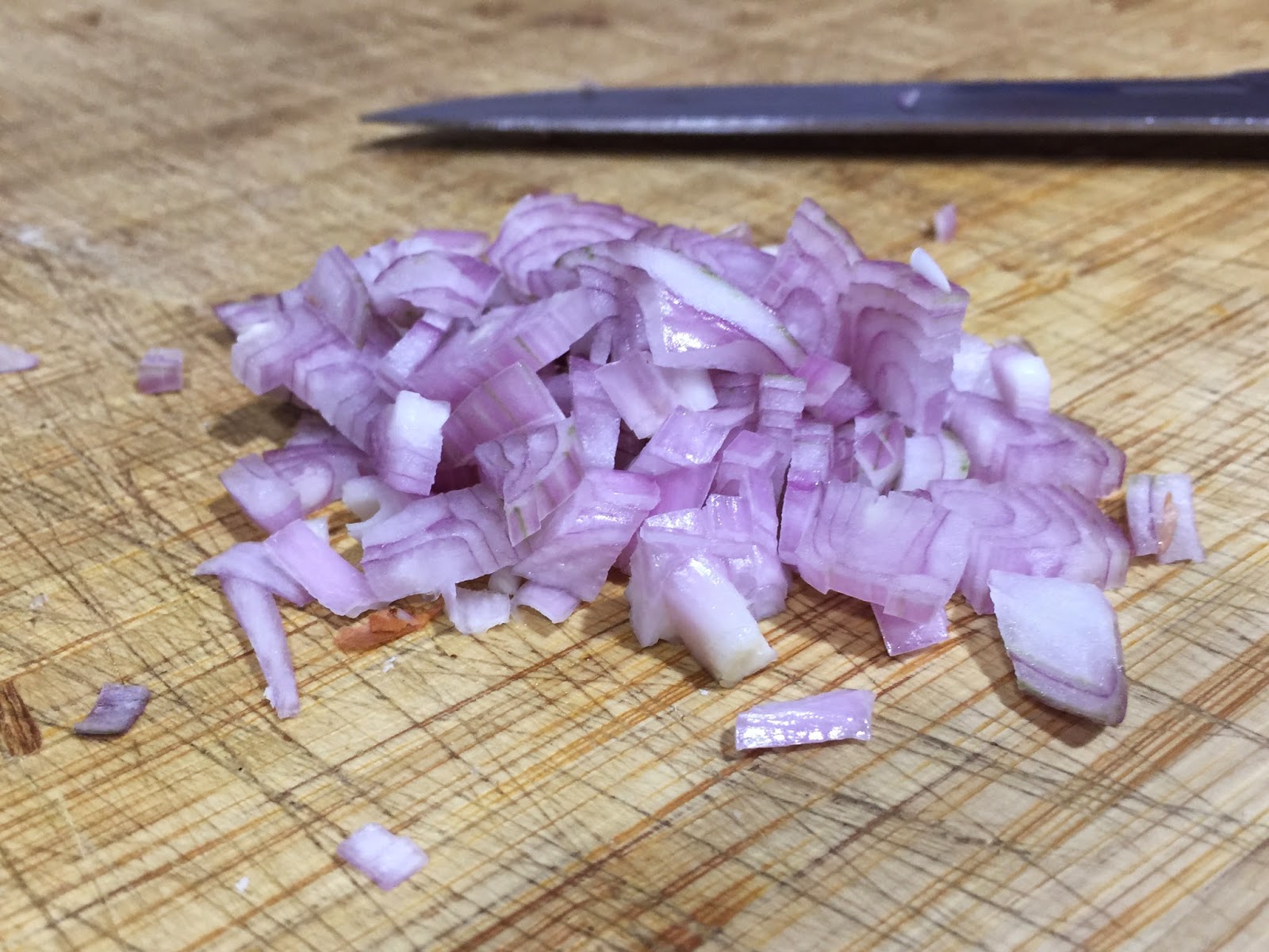 1. Empezamos preparando los ingredientes que le vamos a añadir al aguacate. Siempre escoge una chalota en vez de una cebolla corriente. El tamaño es ideal y el sabor mas suave. La pelamos, lavamos y la cortamos lo mas pequeña posible.