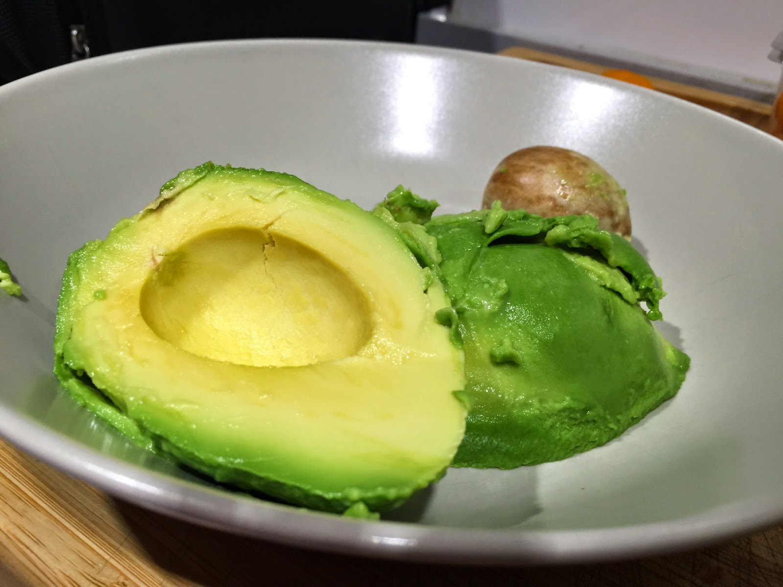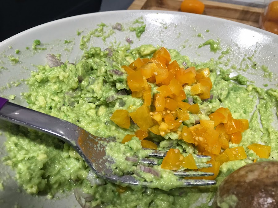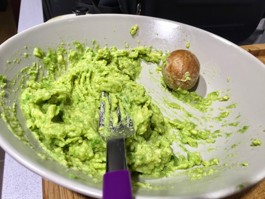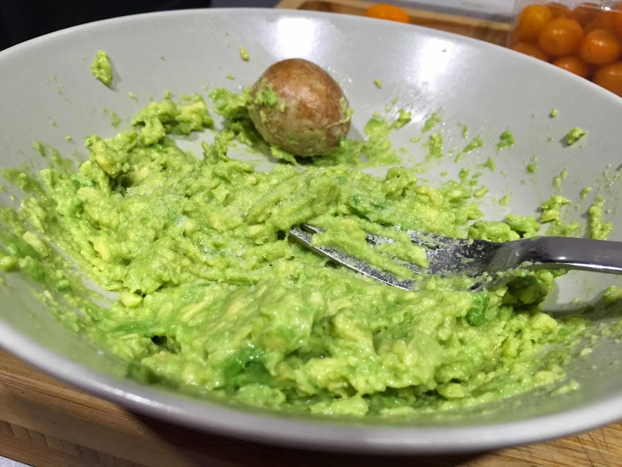 5. Con la ayuda de un tenedor machacamos el aguacate, hasta que quede bien cremoso. Siempre he oído que el hueso del aguacate ayuda a qué no oxide, así que siempre lo mantengo en el plato hasta el momento de servir. No se si es cierto o no, así que por si a caso siempre lo dejo.