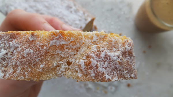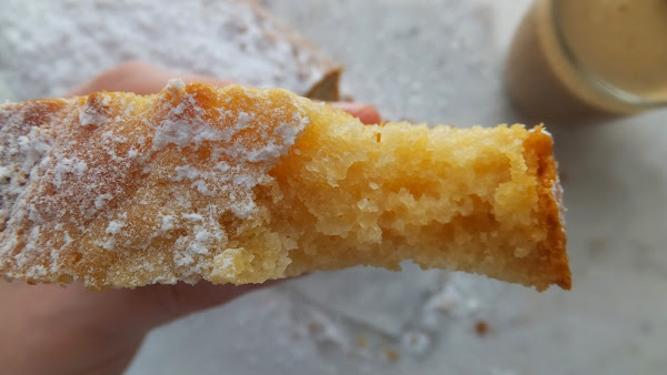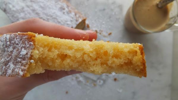 Un wtf en toda regla. El bizcocho, la verdad, es que estaba muy bueno pero daba pena verlo. Lo peor de todo fue que no conseguí mi parte favorita, y la caracteristica principal, del bizocho de mi madre, la abertura superior caramelizada y crujiente por la que todo el mundo se pelea. Puede que fuera solo un intento fallido, y que evidentemente se me olvido vigilarlo, pero lo cierto es que se me quitaron las ganas de profanar una receta que ya es perfecta de por si y no lo he vuelto hacer.