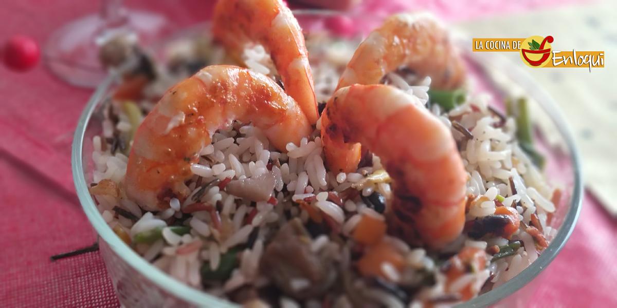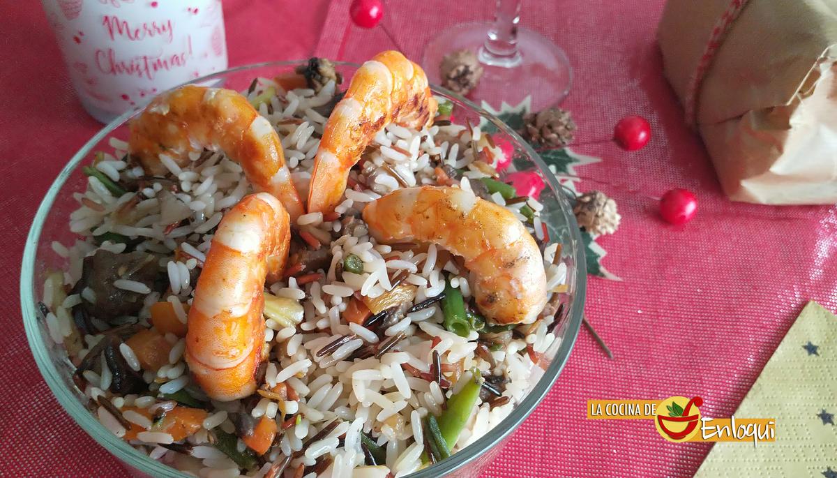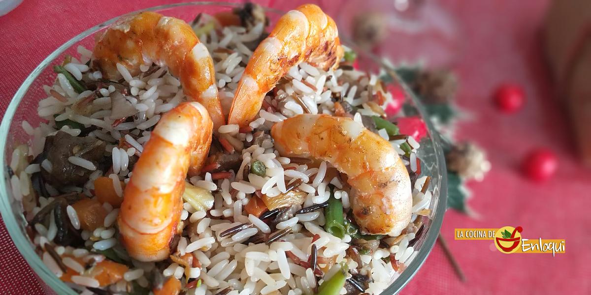 Si aún no sabes con qué acompañar tus mejores recetas esta Navidad, esta Guarnición de arroz salvaje con verduritas y langostinos es una opción deliciosa, vistosa y súper rica.El arroz es un ingrediente buenísimo para acompañar nuestros platos, preparar salteados y ensaladas. En casa nos encanta y lo solemos preparar de mil formas diferentes. Una de nuestras preferidas es la receta de arroz tres delicias pero, como estos días estamos de celebración, te proponemos una opción un poco más vistosa para una mesa especial, aunque lo puedes preparar en cualquier momento porque sus ingredientes son sencillos y su elaboración muy fácil.