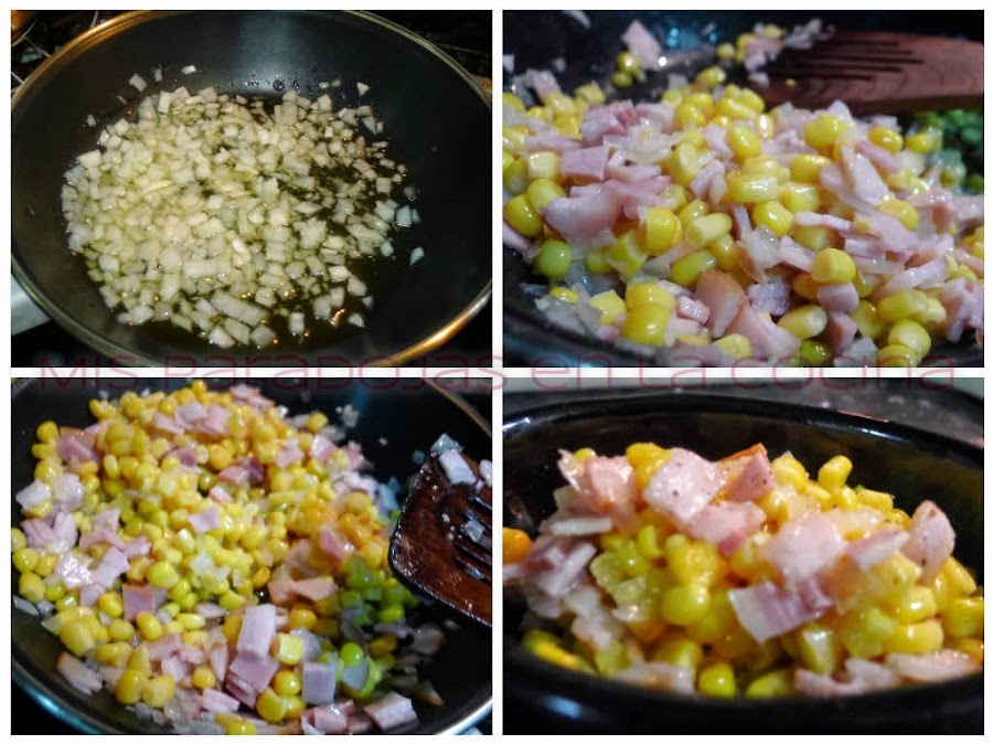 Pocharemos la cebolla picada con un punto de sal; cuando esté transparente añadimos el bacon picado y el maíz escurrido. Rehogamos y rectificamos de sal y pimienta al gusto. Servir caliente.