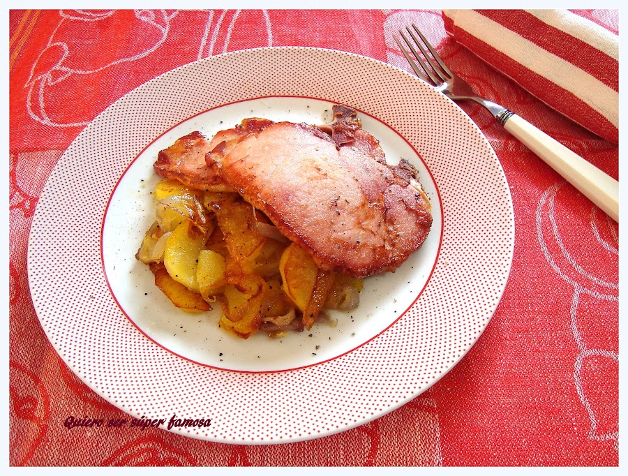 Hacer a la plancha las chuletas. Yo no las he cocinado con aceite sino que he untado la base de la sartén con un poquitín de mantequilla. No hace falta sazonar con sal porque ya tienen.