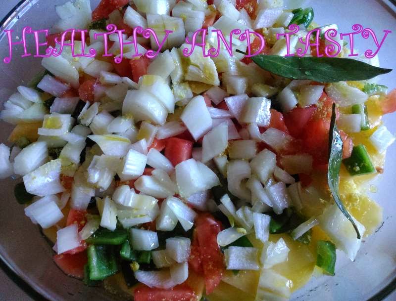 Primero pelamos las patatas y las cortamos en rodajas. Las ponemos en un plato y les añadimos sal. Las removemos para que tomen la sal bien. Cortamos el pimiento, la cebolla y el tomate pelado a daditos. En una fuente apta para microondas ponemos una cucharada de aceite y las patatas encima. Luego ponemos el resto de verduras. Añadimos un poco de agua, el vino, la pastilla de Avecrem espolvoreada, el zumo de limón y el laurel. Ponemos otra cucharada de aceite de oliva encima (opcional).