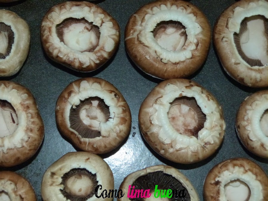 Comenzamos quitando los troncos y colocando los hongos sobre una placa apta para horno de la siguiente manera.