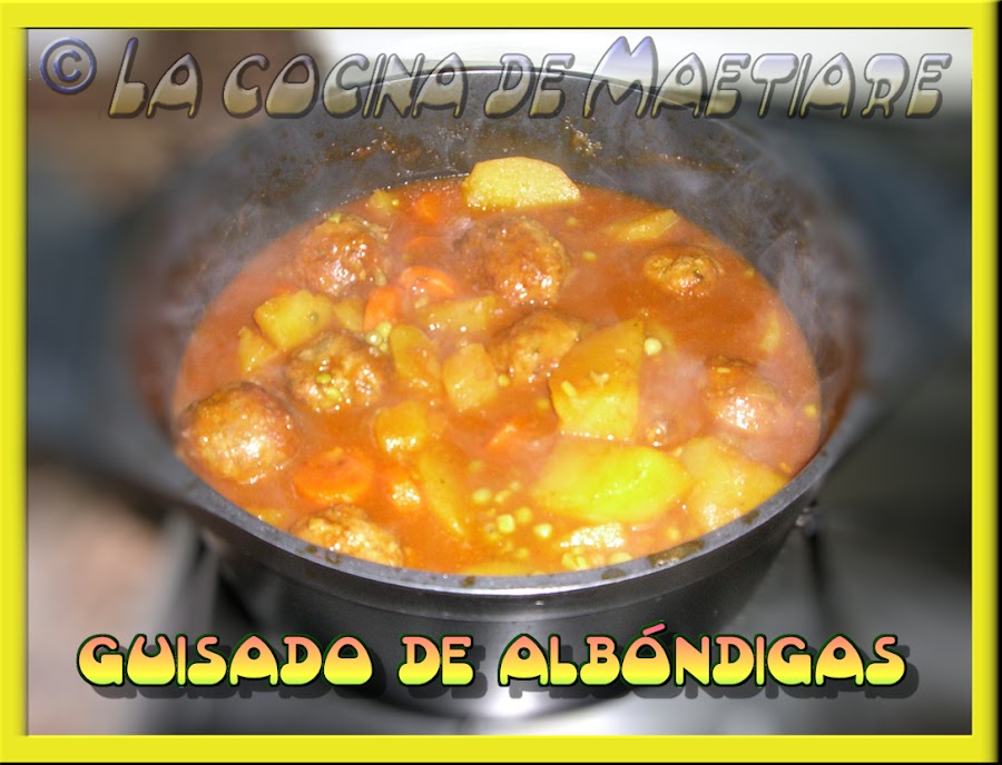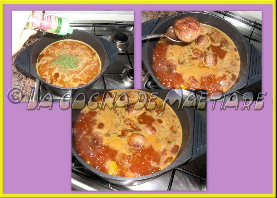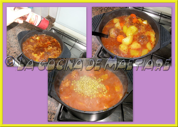 Añadimos chile en escamas de molinillo ( ésto último es al gusto, las cantidades dependerán de lo picante o suave que quieras el guiso ). Cocinamos a fuego medio removiendo de vez en cuando con cuidado para no desmenuzar ni las patatas ni las albóndigas.