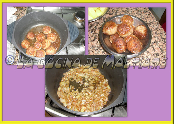 Una vez estén doradas retirarlas y reservarlas aparte. En el mismo aceite en el que hemos frito las albóndigas sofreímos la cebolla cortada a cubitos con un pequeño toque de sal hasta que comience a dorar.