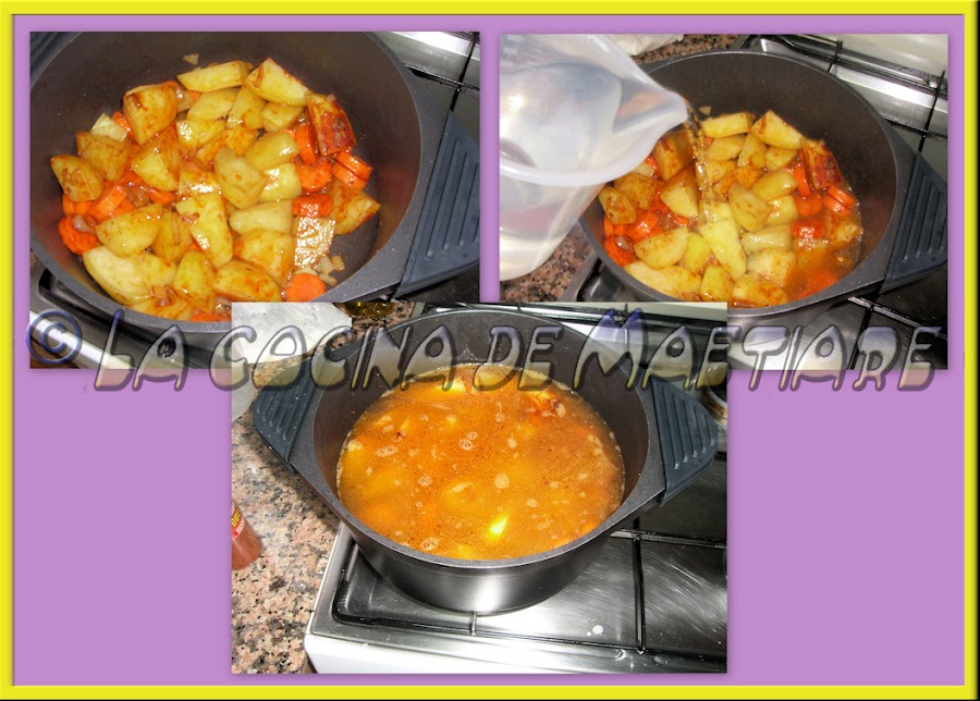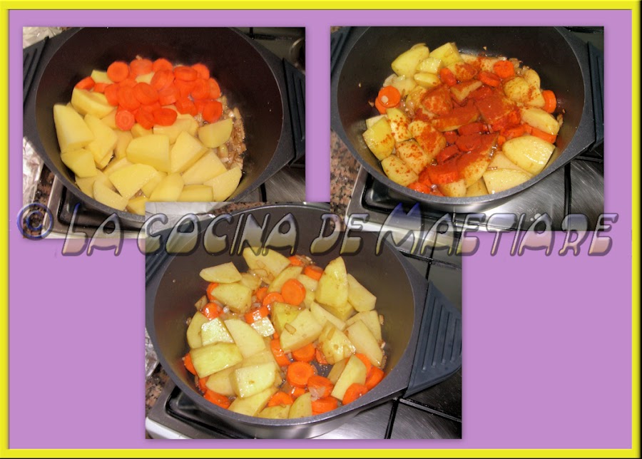 Añadimos las patatas cortadas en trozos grandes y la zanahoria en rodajas, Saltear 2 minutos y añadir un buen toque de pimentón dulce.