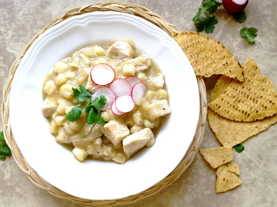 Guisado de cerdo en chile verde y maíz blanco estilo mexicano
