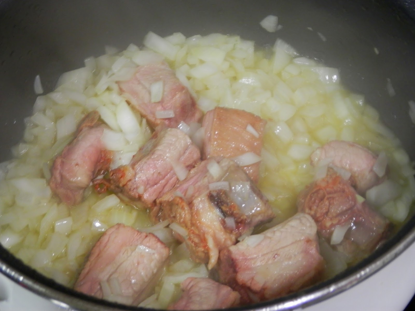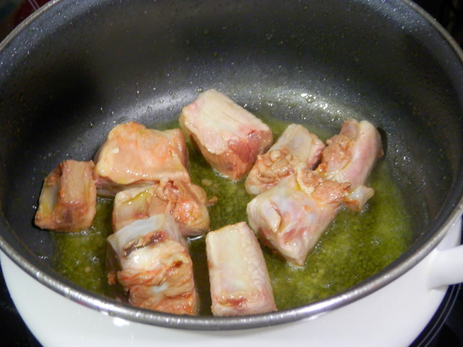 Añadimos las costillas en adobo y sofreímos hasta que estén bien selladas.