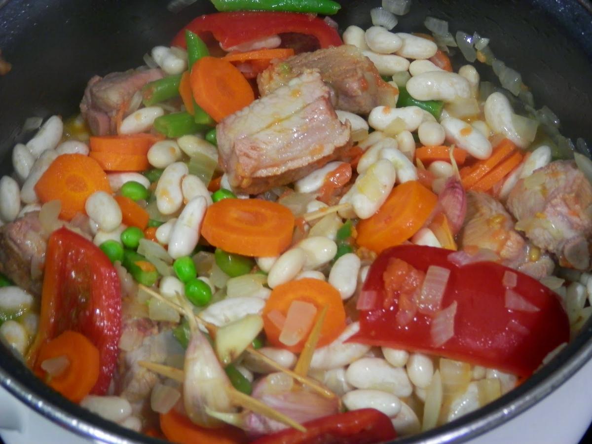Cuando la cebolla esté casi transparente, añadimos los ajos, las bajocas, los guisantes y las zanahorias.
