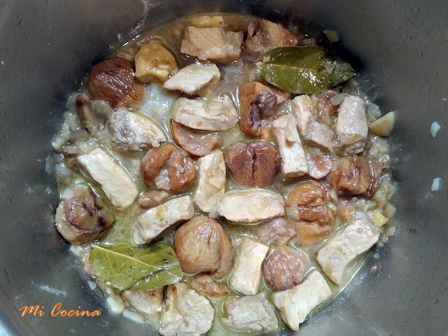 A continuación incorporar las castañas y cubriendo todos los ingredientes con agua.