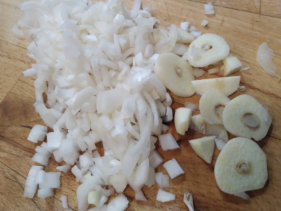 Mientras, pelar el ajo y la cebolla, cortando en trozos pequeños.