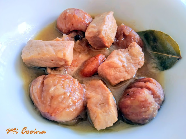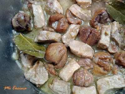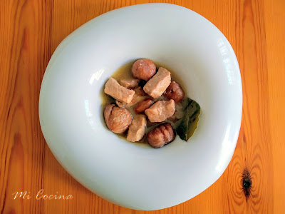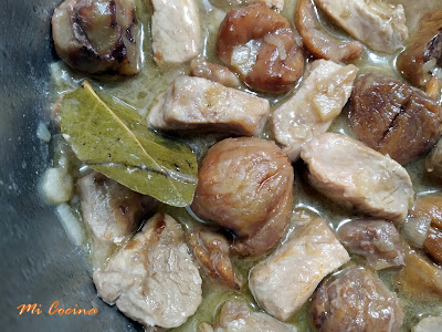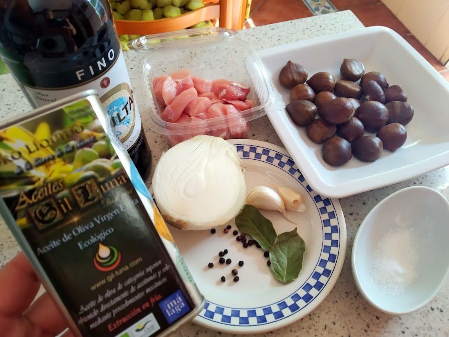 Cuarto y mitad de kilo de lomo de cerdo cortado en trozos pequeños, media cebolla grande (blanca dulce), un diente de ajo, dos hojas de laurel, seis granos de pimienta negra, un vaso mediano de vino blanco (fino amontillado), un vaso grande de agua, sal, un cuarto de kilo de castañas, sal y aceite de oliva virgen extra. (En ésta ocasión con Aceites Gil Luna de El Burgo )