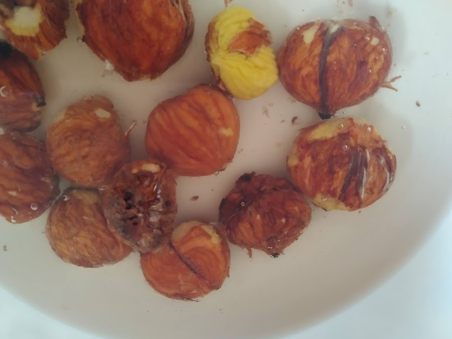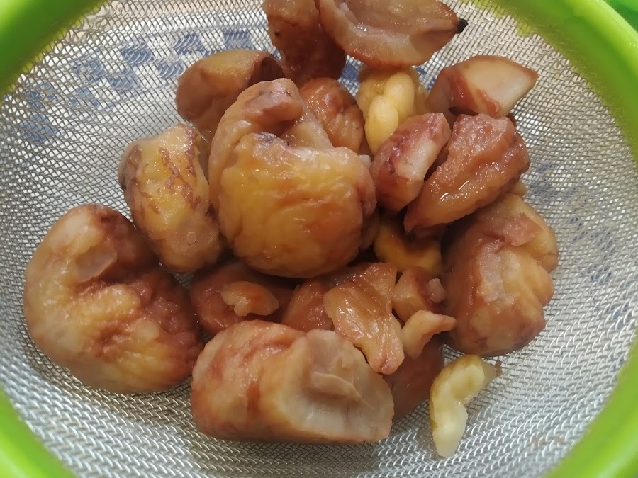 Quitar la cáscara de las castañas. Mientras poner a hervir agua, cuando comience a burbujear introducir las castañas y esperar tres o cuatro minutos, apartar del fuego y cortar la cocción echando agua fría. Mientras aún están caliente ir quitando la piel con cuidado de ir retirándola de los pliegues todo lo posible.