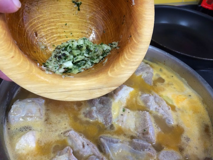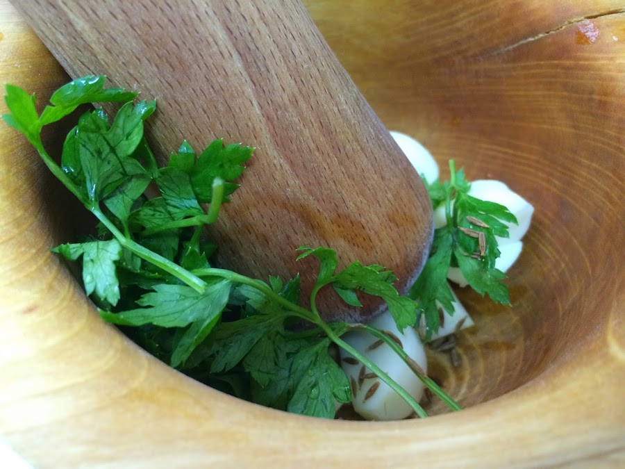 En un mortero hacemos un "majaíllo" con los 3 dientes de ajo pelados, los cominos, la pimienta negra, el perejil y un poco de sal.