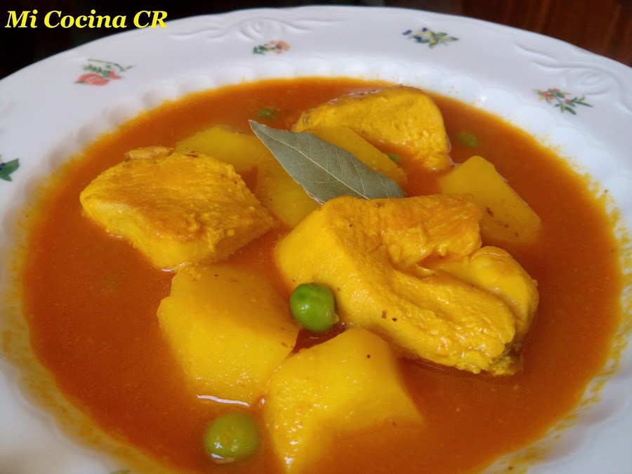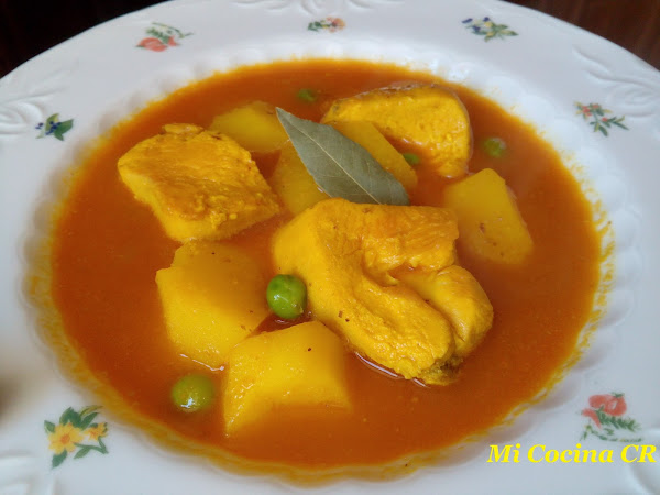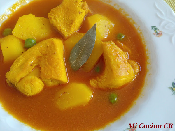 Una pechuga de pollo limpia sin piel y troceada, medio vaso de aceite de oliva virgen extra, treinta almendras con piel, cinco dientes de ajo, un tomate maduro grande, dos rebanadas de pan pequeñas, dos hojas de laurel, cinco granos de pimienta negra, tres patatas medianas, colorante alimentario (suelo usar una carterilla de la marca "Aeroplano"), un vaso pequeño de vino blanco, agua, sal y un puñaito de chicharos.