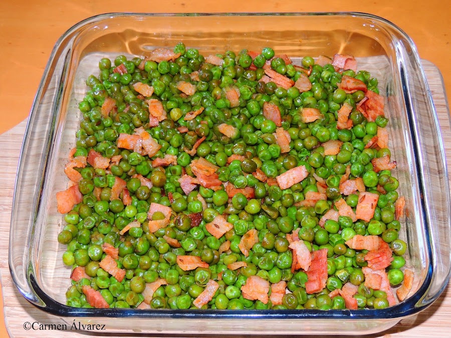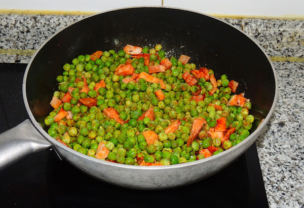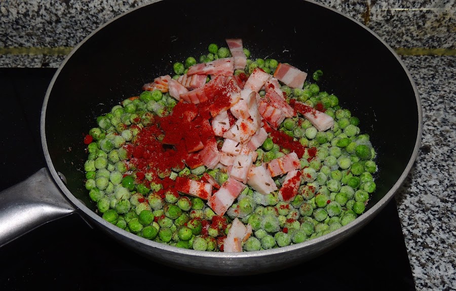 Se sacan de la sartén y se reservan, en ese mismo aceite se añaden los guisantes directos de la bolsa de congelados, el bacon cortado a trozos,el pimentón y la sal. Y se mezcla todo bien.