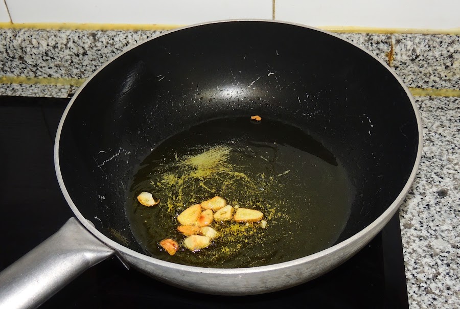 Se pelan los dientes de ajo, se cortan en láminas y se sofríen en aceite caliente.