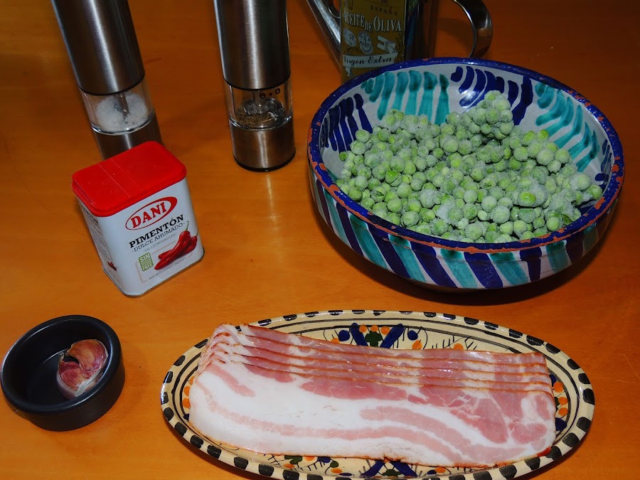 500 gr. de guisantes congelados, 2 dientes de ajo, 100 gr. de bacon, media cucharadita de pimentón dulce, media de comino, aceite de oliva y sal.