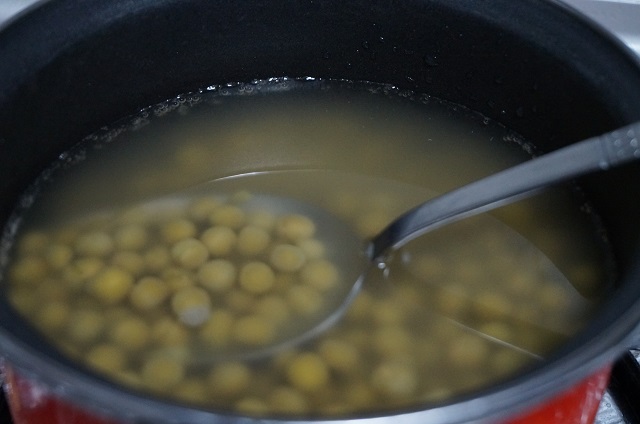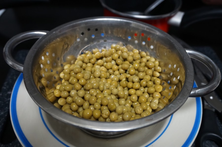 Lo primero pondremos a cocer los guisantes. Ponemos un cazo con bastante agua y un poquito de sal, cuando empiece a hervir echaremos los guisantes, si son congelados o frescos los dejaremos hasta que estén tiernos.