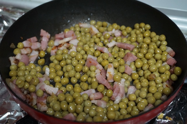 Y cuando esté un poco dorado el bacon añadimos los guisantes,un poquito de pimienta lo removemos todo bien para que se integren los sabores.