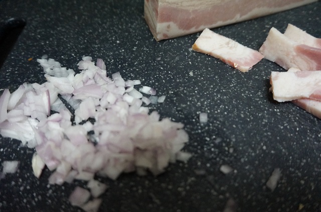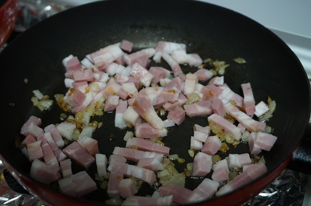 Ponemos una sartén con 4 cucharadas de aceite, pocharemos la cebolla hasta que empiece a tomar color, luego añadiremos el bacon.