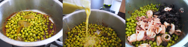 Añadir los guisantes cocidos y, aproximadamente, la mitad de la crema ligera de guisantes. Incorporar seguidamente los chipirones y la butifarra negra.