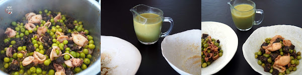 Servir las raciones en plato hondo y añadir, en mesa, un cacito de la crema de guisantes. Listo para disfrutar!!!