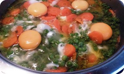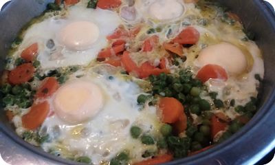 Casca los huevos en un plato primero o taza y ve añadiéndolos a los guisantes.