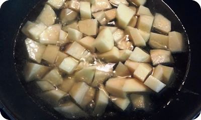 Pela las patatas y corta en cuadraditos. Pon a calentar abundante aceite de oliva en una sartén y fríelas.