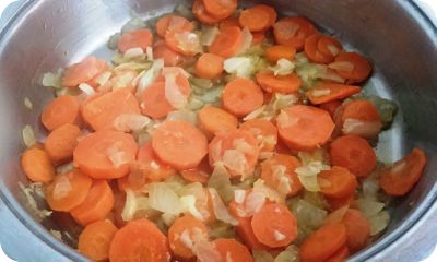 Cuando la cebolla se ponga transparente, añade las zanahorias cortadas en rodajas y sofríe todo junto a fuego medio unos minutos más.