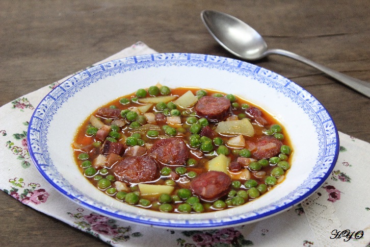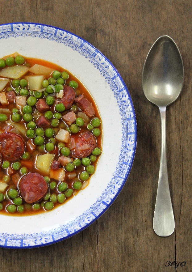 3. Dejamos hervir unos cinco minutos para que el alcohol se evapore y añadimos caldo hasta cubrir (yo puse dos vasos y medio) los guisantes. No pongo sal porque es suficiente con la de los embutidos.