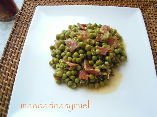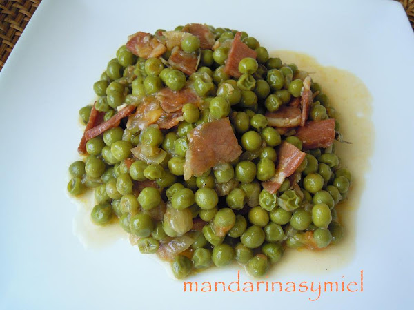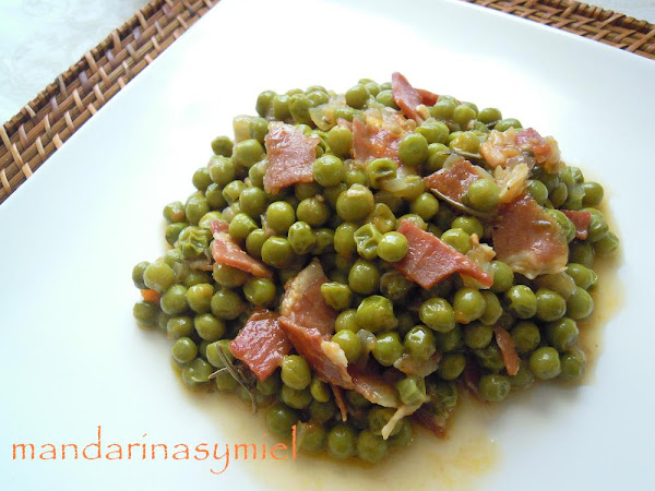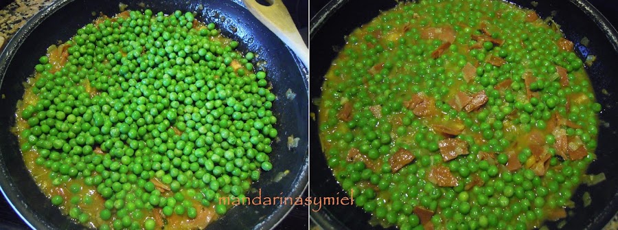 Añade los guisantes y una tacita de agua caliente, deja que se cuezan a fuego lento unos 10 minutos, removiendo de vez en cuando con una cuchara, ten cuidado de que no se revienten, apaga el fuego y deja reposar.