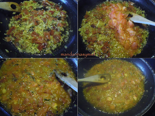 Añade los tomates troceados, deja que cueza todo unos 5 minutos.
