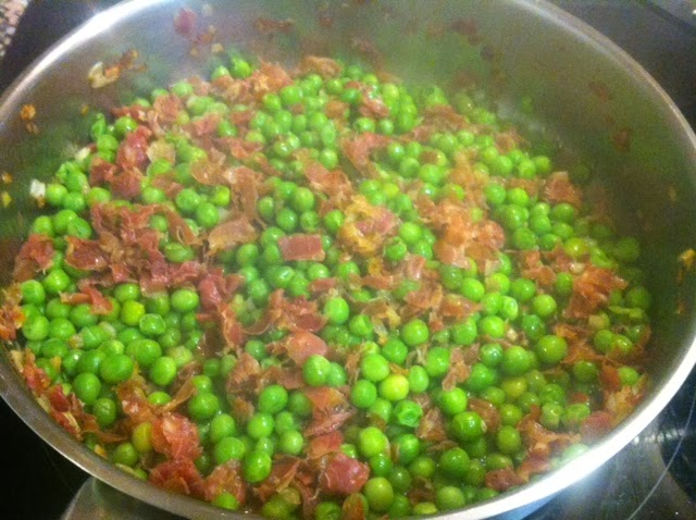Echar los guisantes y dejar cocinar todos removiendo cuidadosamente a fuego medio otros 2-3 minutos.