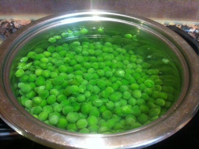 Ponemos un cazo con agua (suficiente para tapar bien los guisantes), sal y una pastilla de caldo concentrado. Cuando rompa a hervir, echamos los guisantes y dejamos cocer el tiempo que indique el envase (normalmente 6-8 minutos). Una vez transcurrido este tiempo, sacar con una espumadera los guisantes y reservar el caldo de la cocción para hacer posteriormente en la misma cazuela y en el mismo agua los huevos.