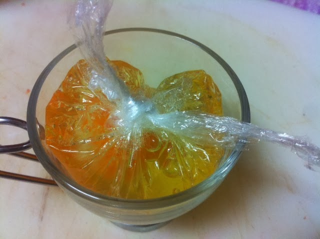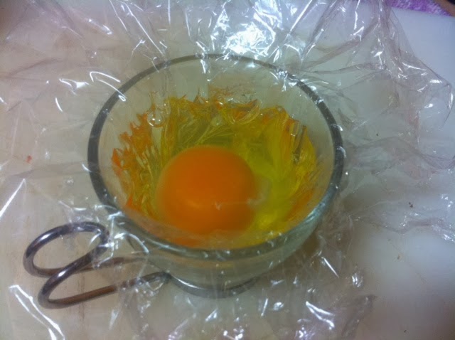 Para ello, con ayuda de una taza o similar, poner un trozo de film que llegue hasta el fondo de la taza y sobresalga por los lados (mirar la foto), echar una pizca de aceite y otra de sal y cascar el huevo dentro. Cerrar, haciendo un nudo fuerte uniendo los 4 extremos (2 y 2).